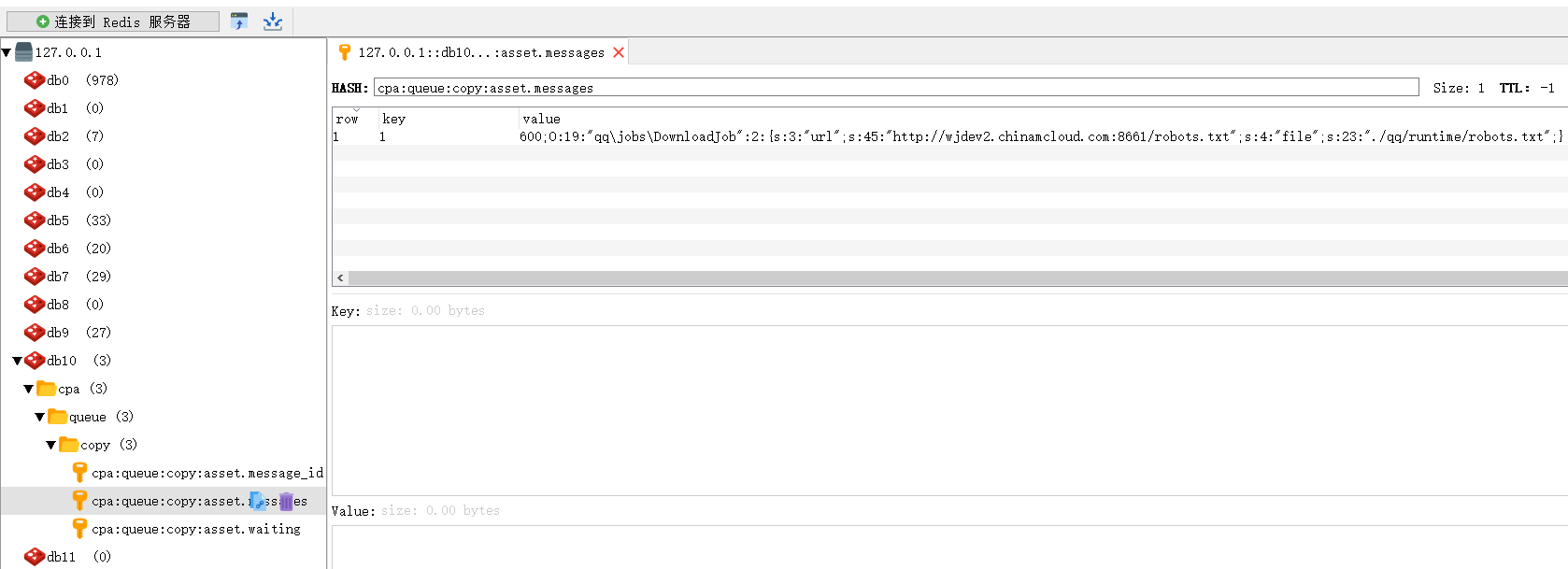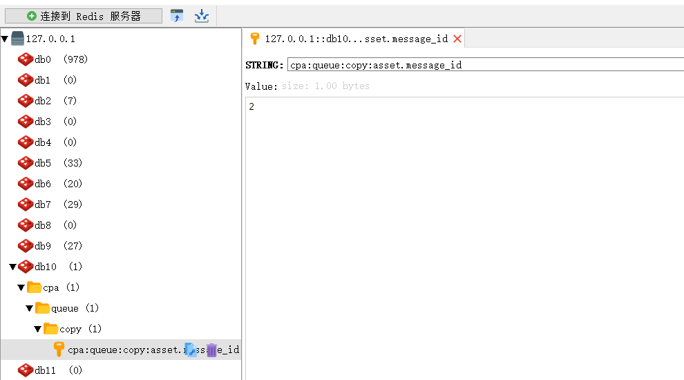 13、查看 Redis ,键:cpa:queue:copy:asset.messages、cpa:queue:copy:asset.waiting 均已经被删除,如图3