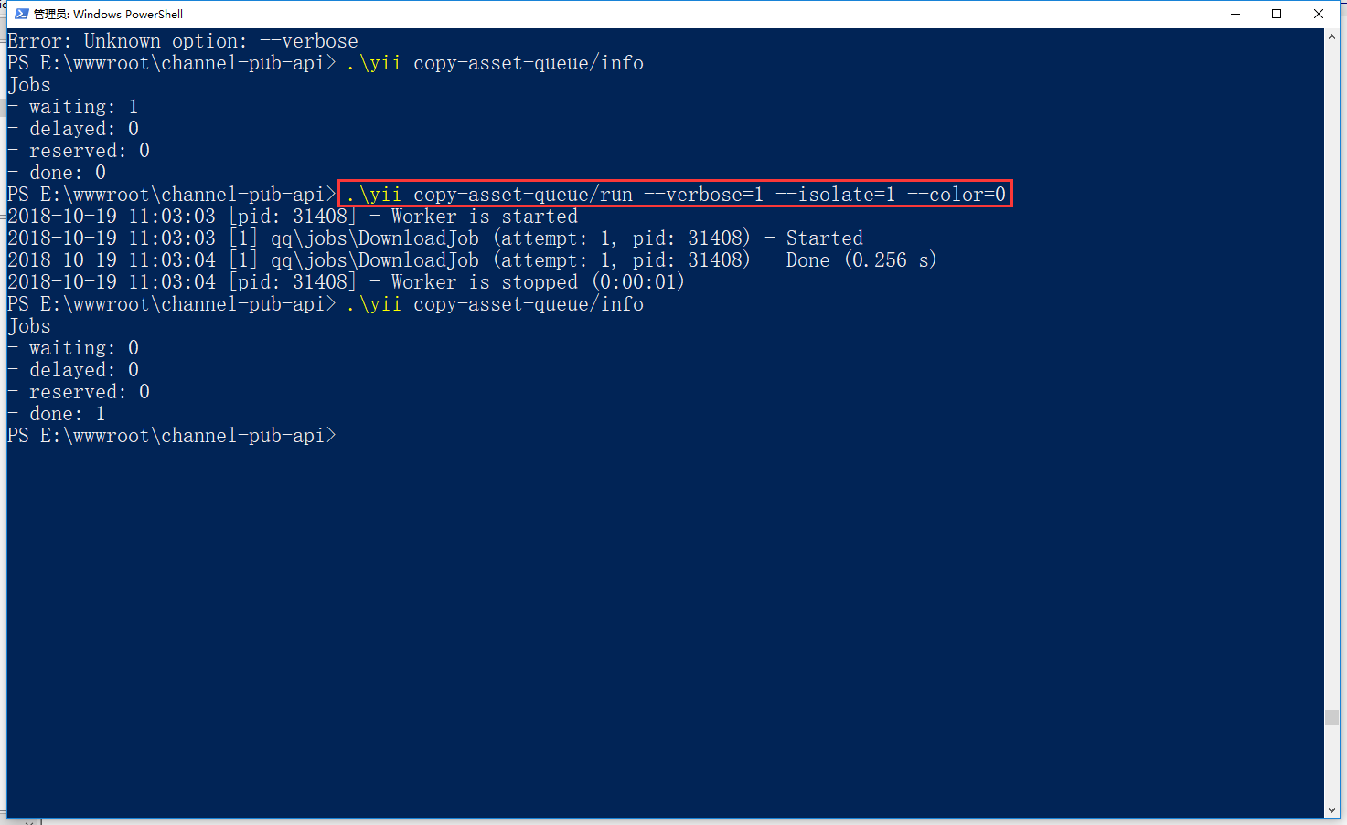 .\yii copy-asset-queue/run --verbose=1 --isolate=1 --color=0 .\yii copy-asset-queue/info