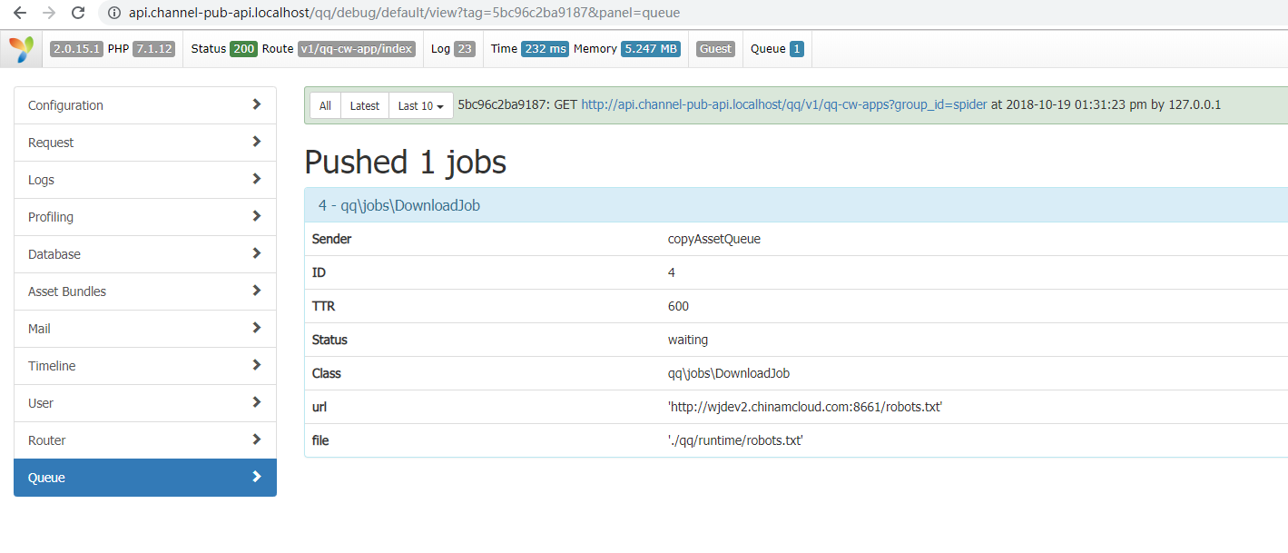 16、查看 Yii2 调试模块,已经增加 queue 面板,如图5
