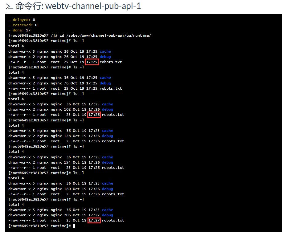 25、Supervisor 配置已生效,会自动处理队列中的任务,/sobey/www/channel-pub-api/qq/runtime/robots.txt 文件的生成时间时刻在更新中,如图7