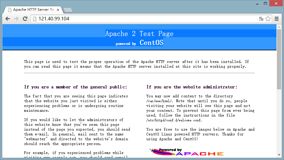 如果出现:Apache 2 Test Page powered by CentOS,则说明httpd服务安装、启动成功;