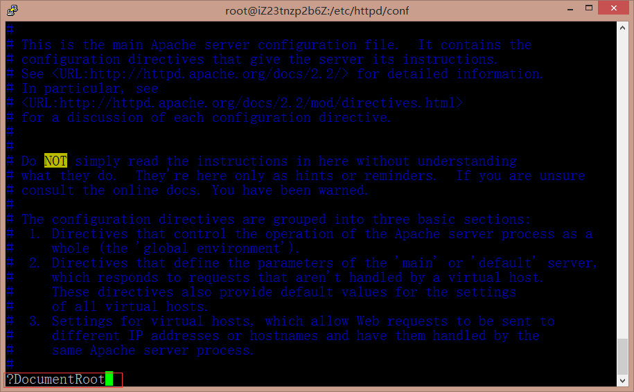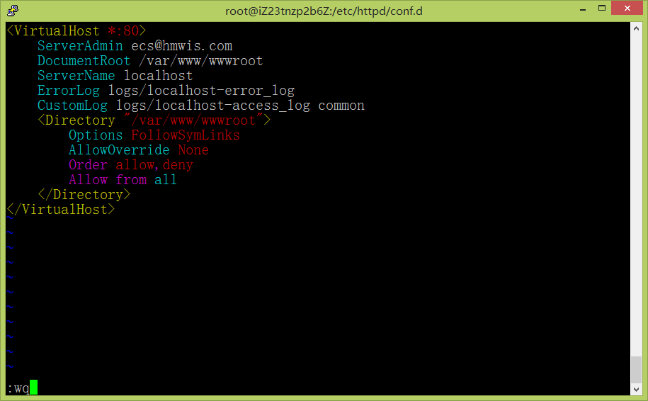 使用i键来进入编辑模式,却除NameVirtualHost *:80的#号,使其支持虚拟主机;