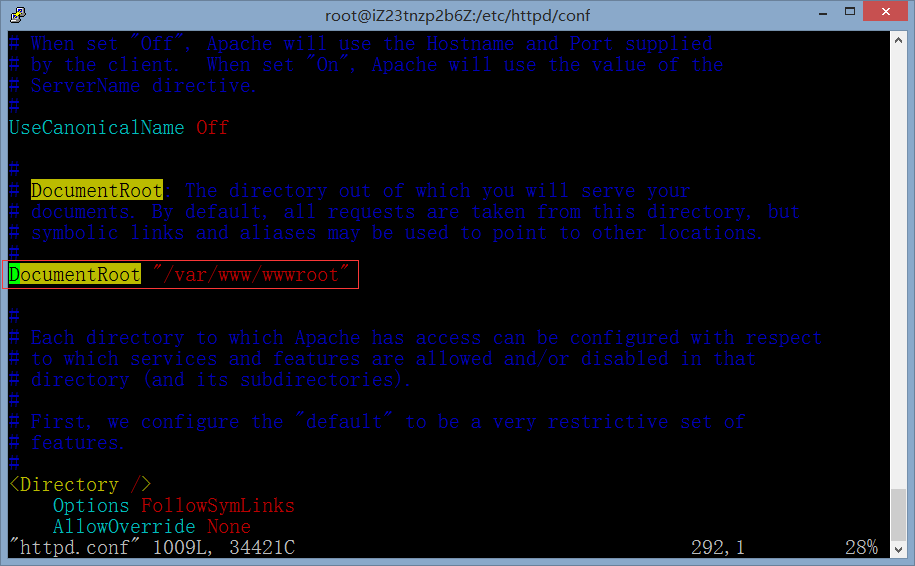 使用i键来进入编辑模式,修改默认网站根目录为:/var/www/wwwroot