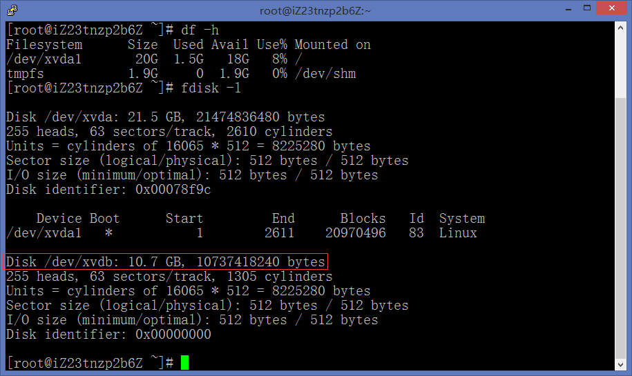 友情提示:若您执行fdisk -l命令,发现没有 /dev/xvdb 表明您的云服务无数据盘,那么您无需进行挂载,此时该教程对您不适用
