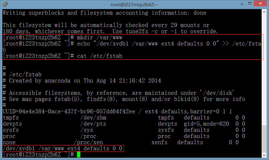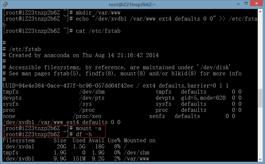 echo “/dev/xvdb1 /var/www ext4 defaults 0 0” >> /etc/fstab