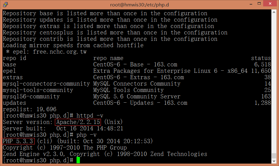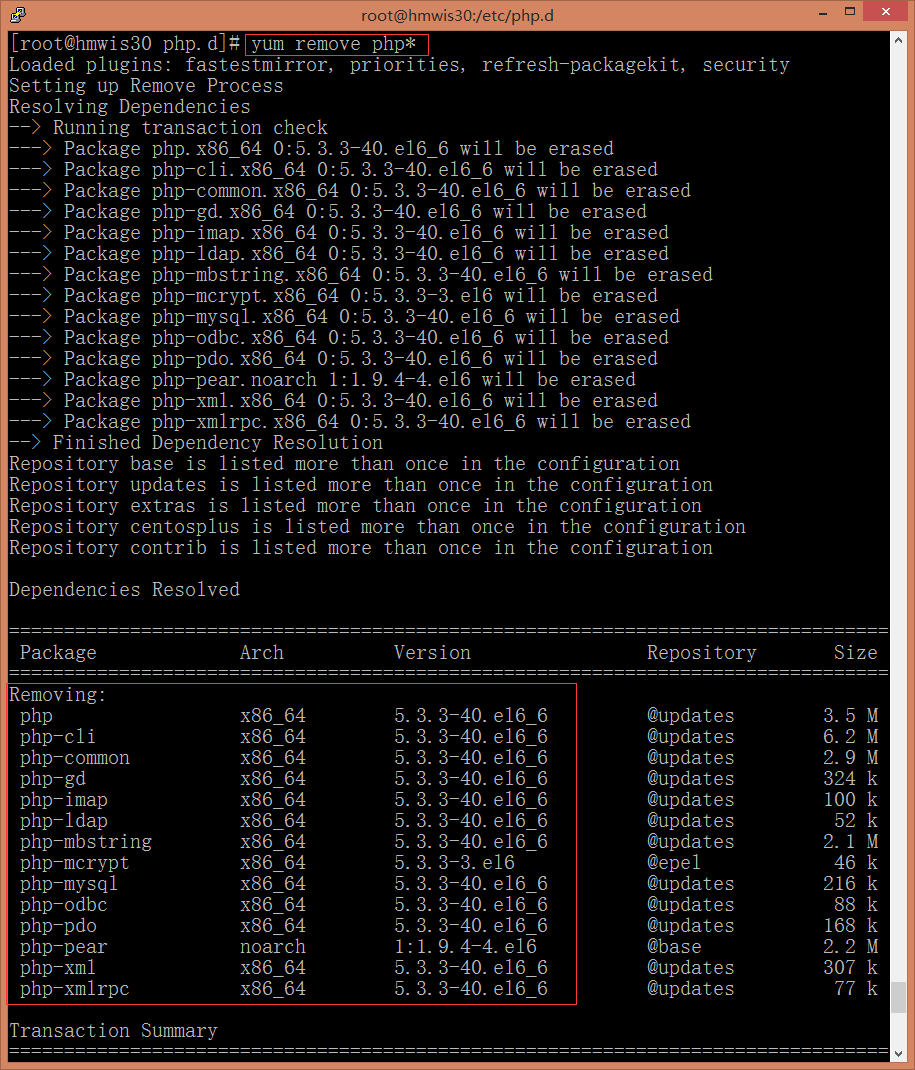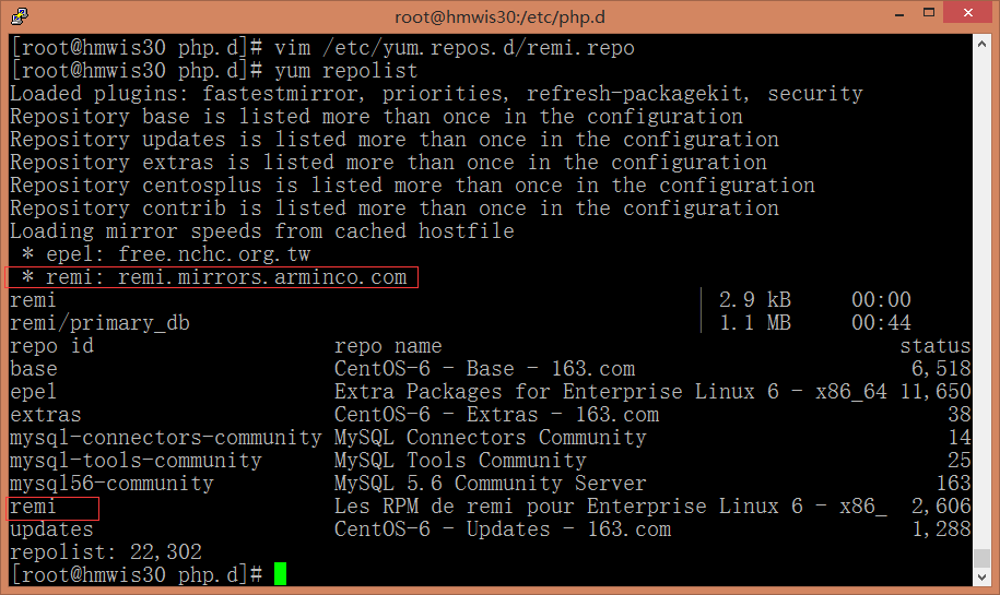 4、执行 yum repolist命令,查看是否添加remi源成功5、卸载php 5.3.3版本相关程序