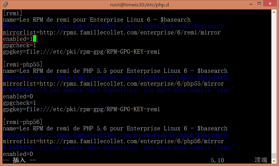 3、编辑/etc/yum.repos.d/remi.repo,设置[remi]下的enabled=1,[remi]表示php 5.4版本,下还有5.5与5.6,此处采用5.4