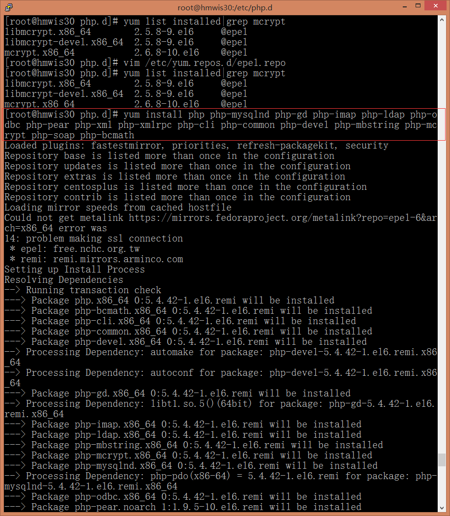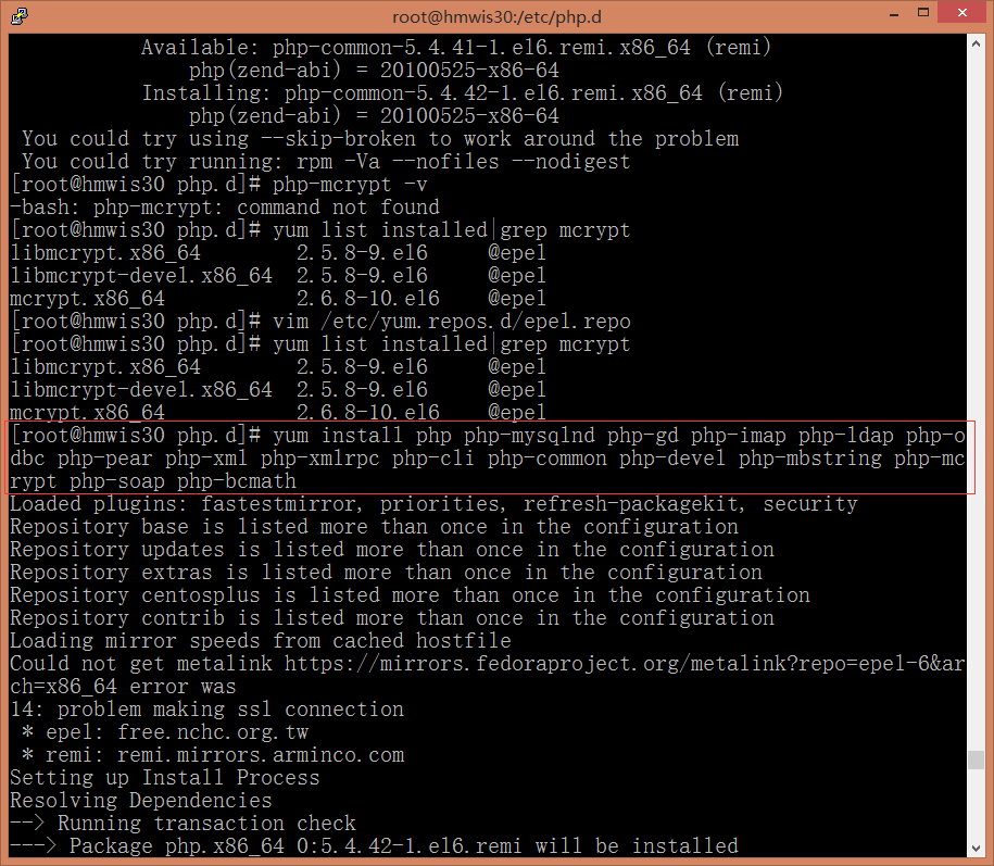 7、执行命令失败,因为php-mcrypt仍然是基于epel源安装,而其最新版本为5.3.3,需要让其基于remi源安装5.4版本才是