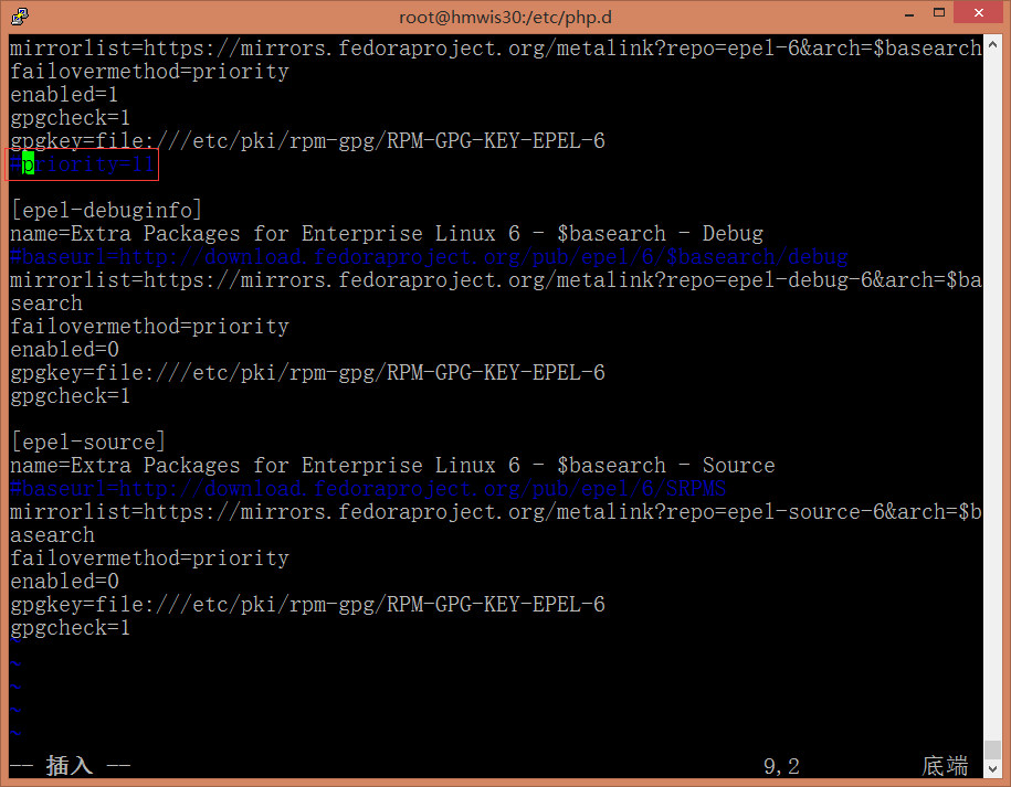 8、修改/etc/yum.repos.d/epel.repo文件,将priority=11修改为#priority=1
