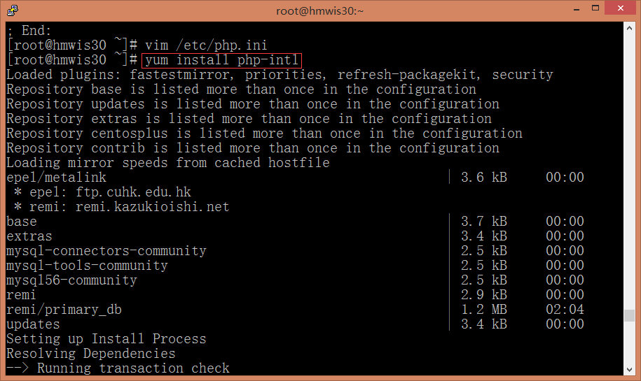 4、在CentOS上运行命令:yum install php-intl,以安装intl扩展: