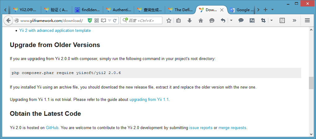 1、打开网址,http://www.yiiframework.com/download/,根据提示执行升级: