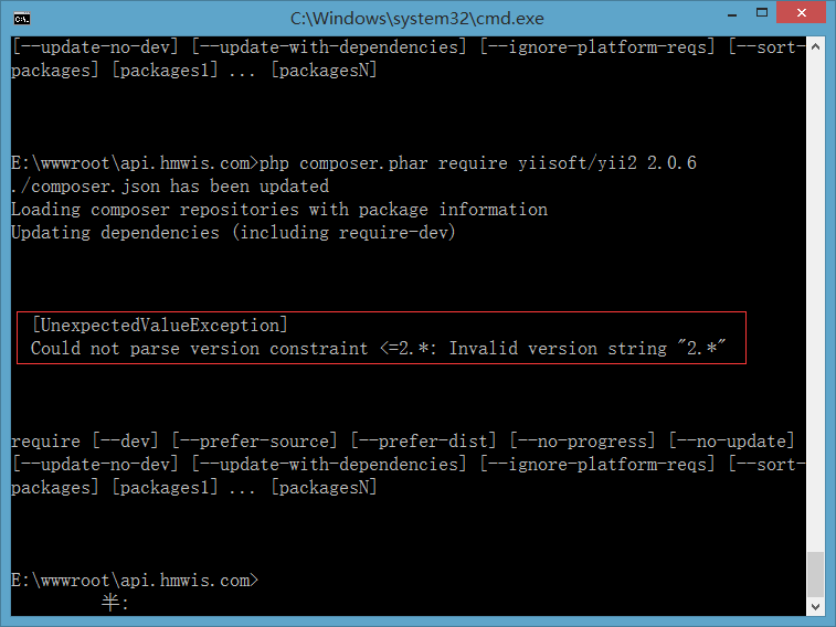 2、执行命令:php composer.phar require yiisoft/yii2 2.0.6,报错: