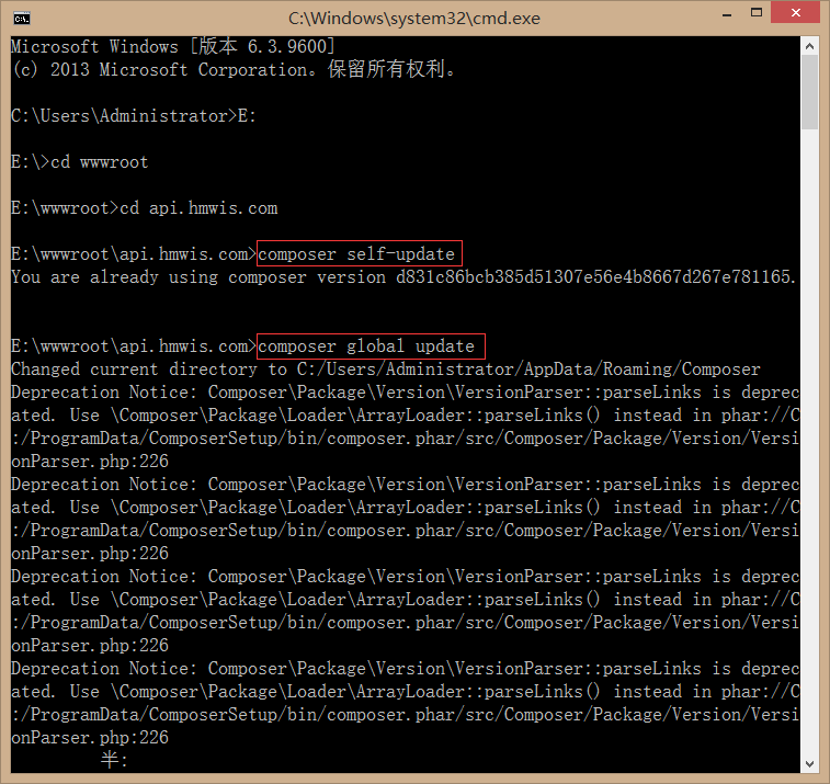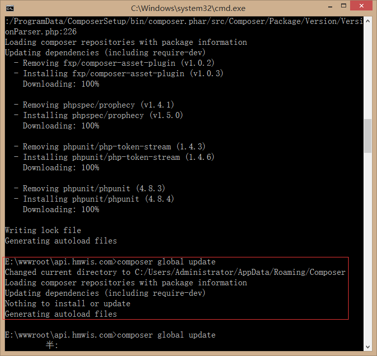 3、相继执行命令:composer self-update,composer global update;