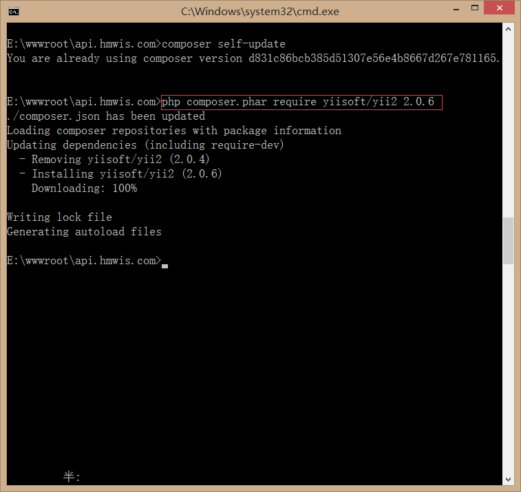 5、再次执行命令:php composer.phar require yiisoft/yii2 2.0.6,升级成功;