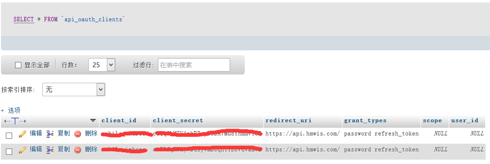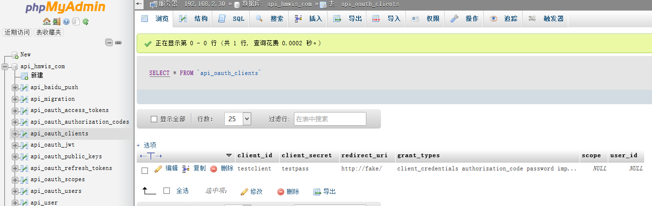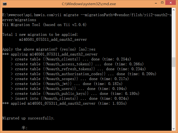 6、再次运行:yii migrate –migrationPath=@vendor/filsh/yii2-oauth2-server/migrations