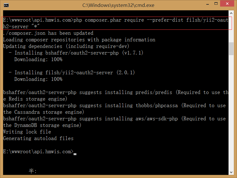 运行:php composer.phar require –prefer-dist filsh/yii2-oauth2-server “*”