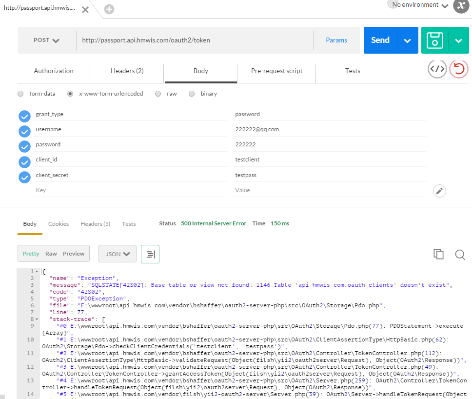 “SQLSTATE[42S02]: Base table or view not found: 1146 Table ‘api_hmwis_com.oauth_clients’ doesn’t exist”