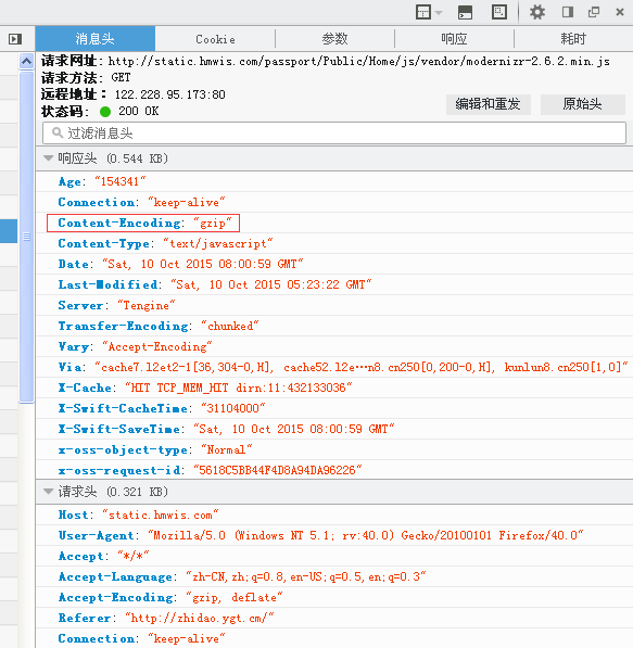 6、在firebug中查看,发现状态码为200的时候,响应头中具有gzip