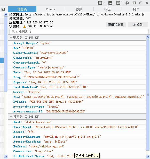 7、在firebug中查看,发现状态码为304的时候,响应头中不具有gzip