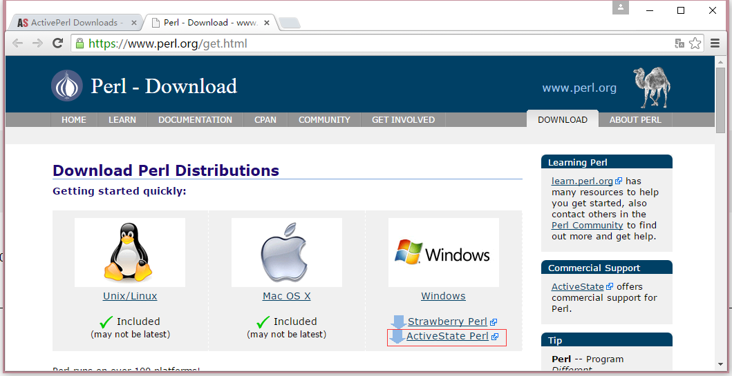 2、安装perl,打开:https://www.perl.org/ ,如图1,在Windows下分为Strawberry Perl与ActiveState Perl两个版本,在此选择ActiveState Perl;
