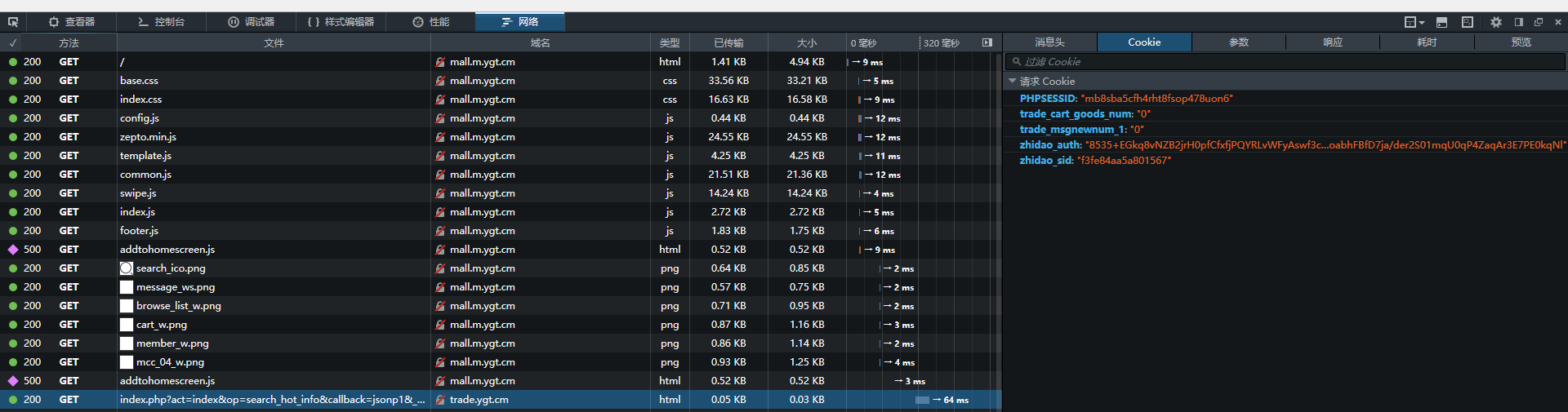 4、查看网络,发现请求Cookie中已经与当前网址保持一致,如图1.3