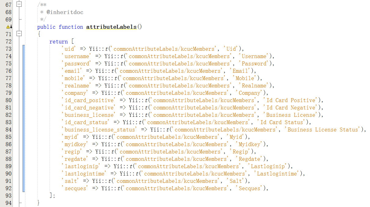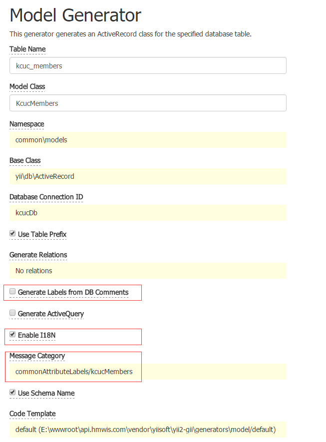 2、Use Table Prefix:使用表前缀要勾选;Generate Labels from DB Comments:基于DB注释生成标签不勾选(因为后期要进行人工翻译处理);Enable I18N:启用国际化要勾选;Message Category:信息分类设置为commonAttributeLabels/kcucMembers,这是启用国际化的情况下被Yii::t()所使用的类别,以用于当前模型类下的属性标签,生成后如图2: