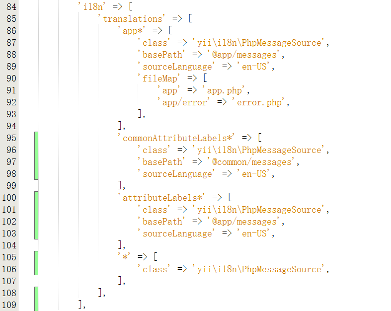 模式 attributeLabels* 表示所有以 attributeLabels 开头的消息类别名称都使用这个翻译的消息来源。其根路径为当前应用。