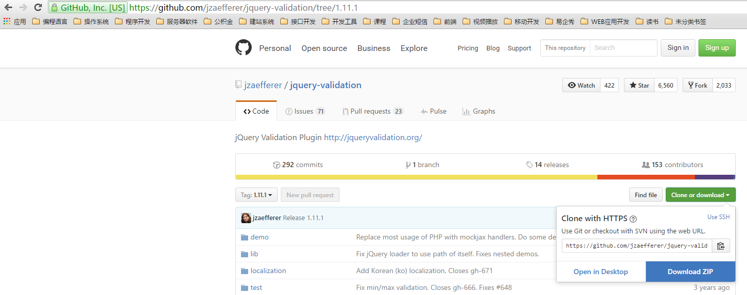9、打开网址:https://github.com/jzaefferer/jquery-validation ,下载jquery-validation的1.11.1版本,因为当前网页所使用的便是此版本,如图10、11:
