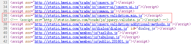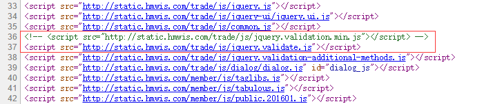 11、网页源代码中,将引入jquery.validation.min.js先给注释,引入jquery.validate.js,以方便开发期间调试,如图14:
