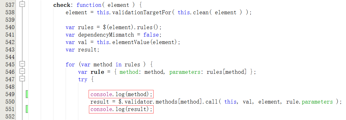 16、在check方法中,插入console.log(method);console.log(result);如图19: