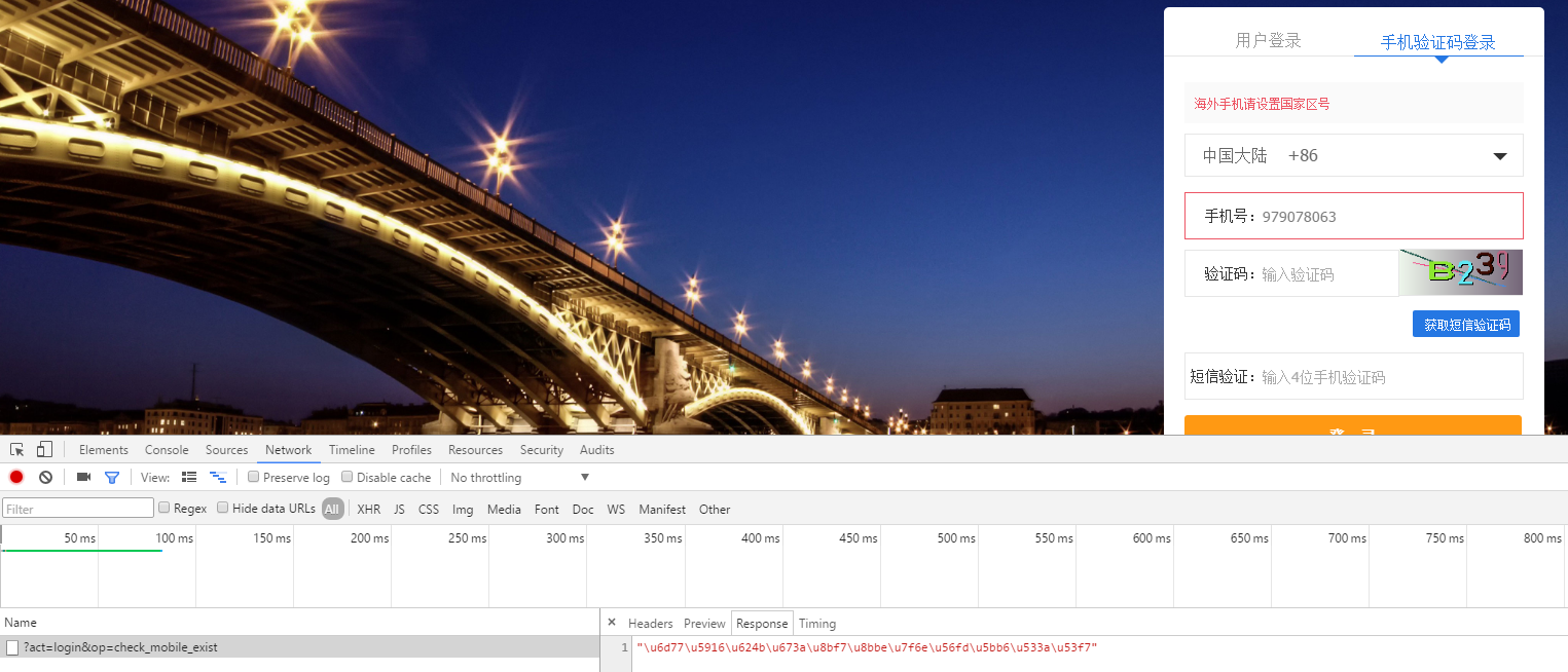 6、输入一个已经注册的中国大陆手机号码,手机号码的远程验证返回true,但是国家区号仍然报错,如图7: