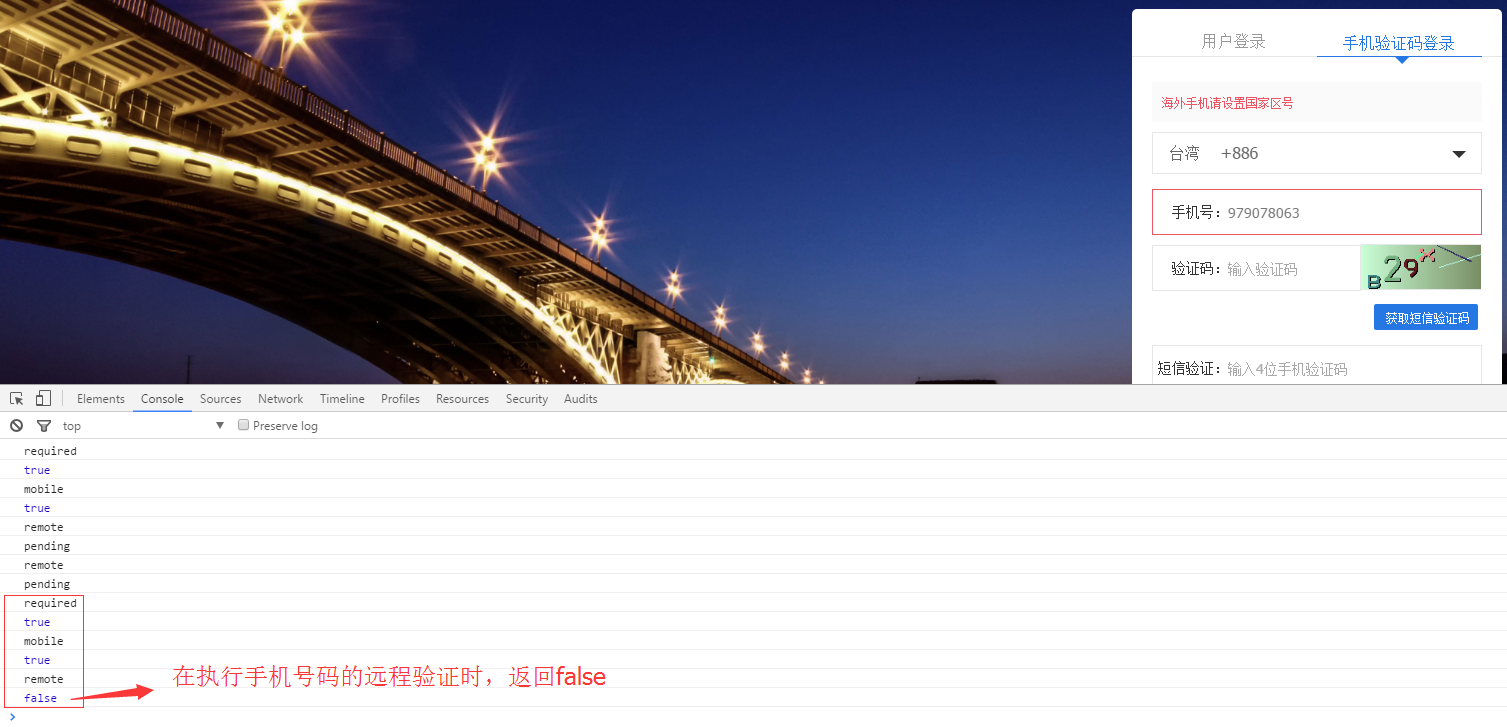 15、继续执行第2、3步,查看Console,可以确定当result为false的时候,则手机号码的远程验证没有执行,如图18: