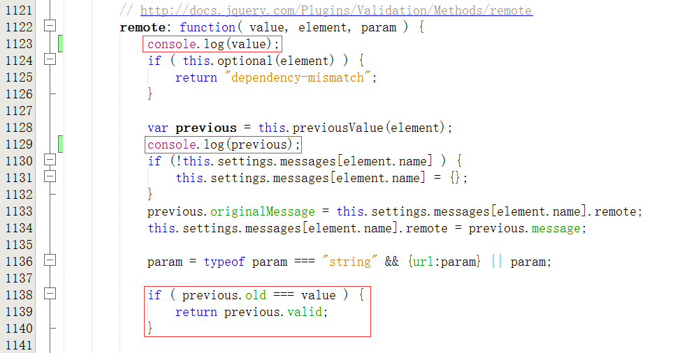 18、在内置验证方法methods列表的remote中,插入console.log(value);console.log(previous);如图21: