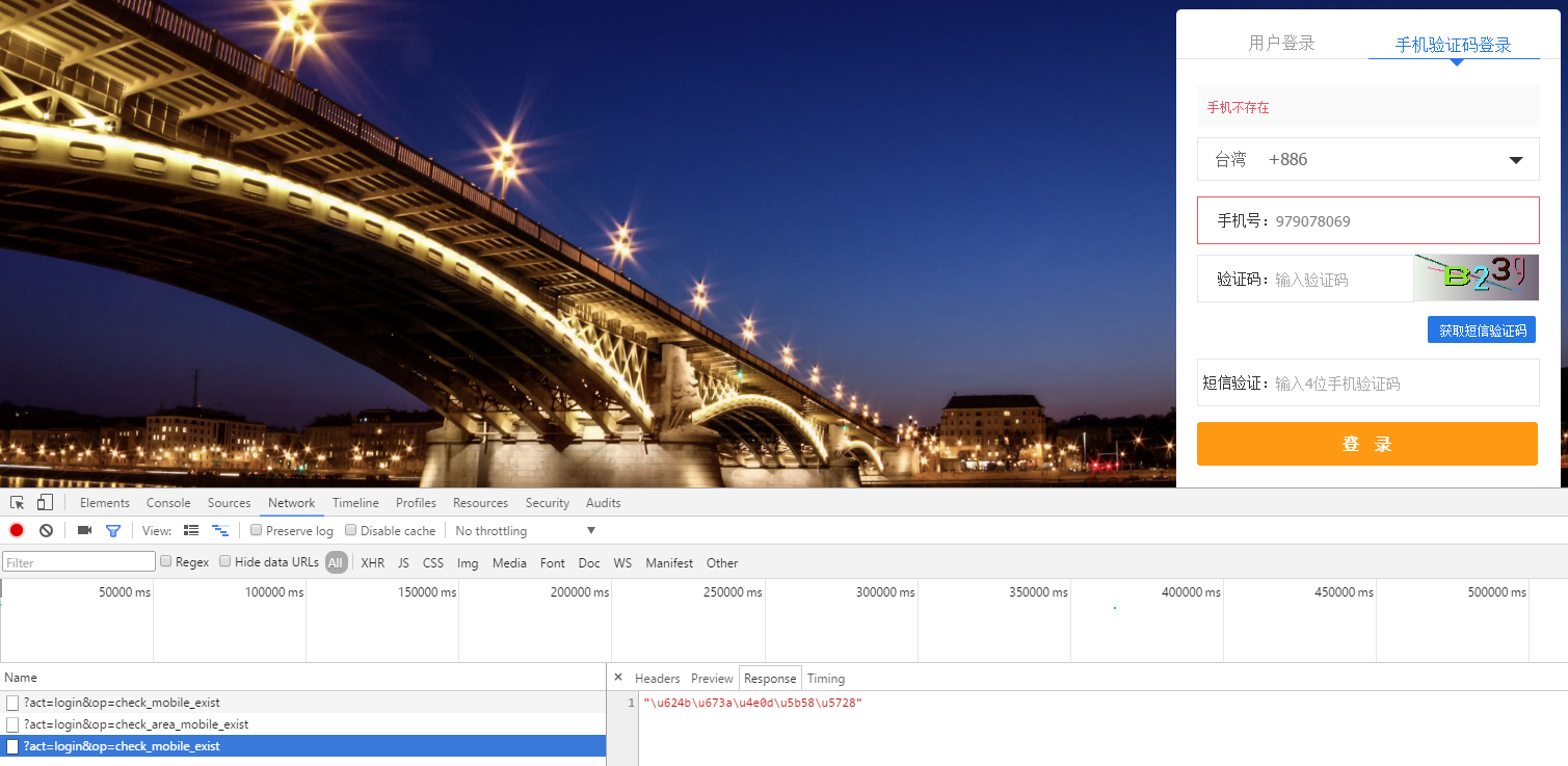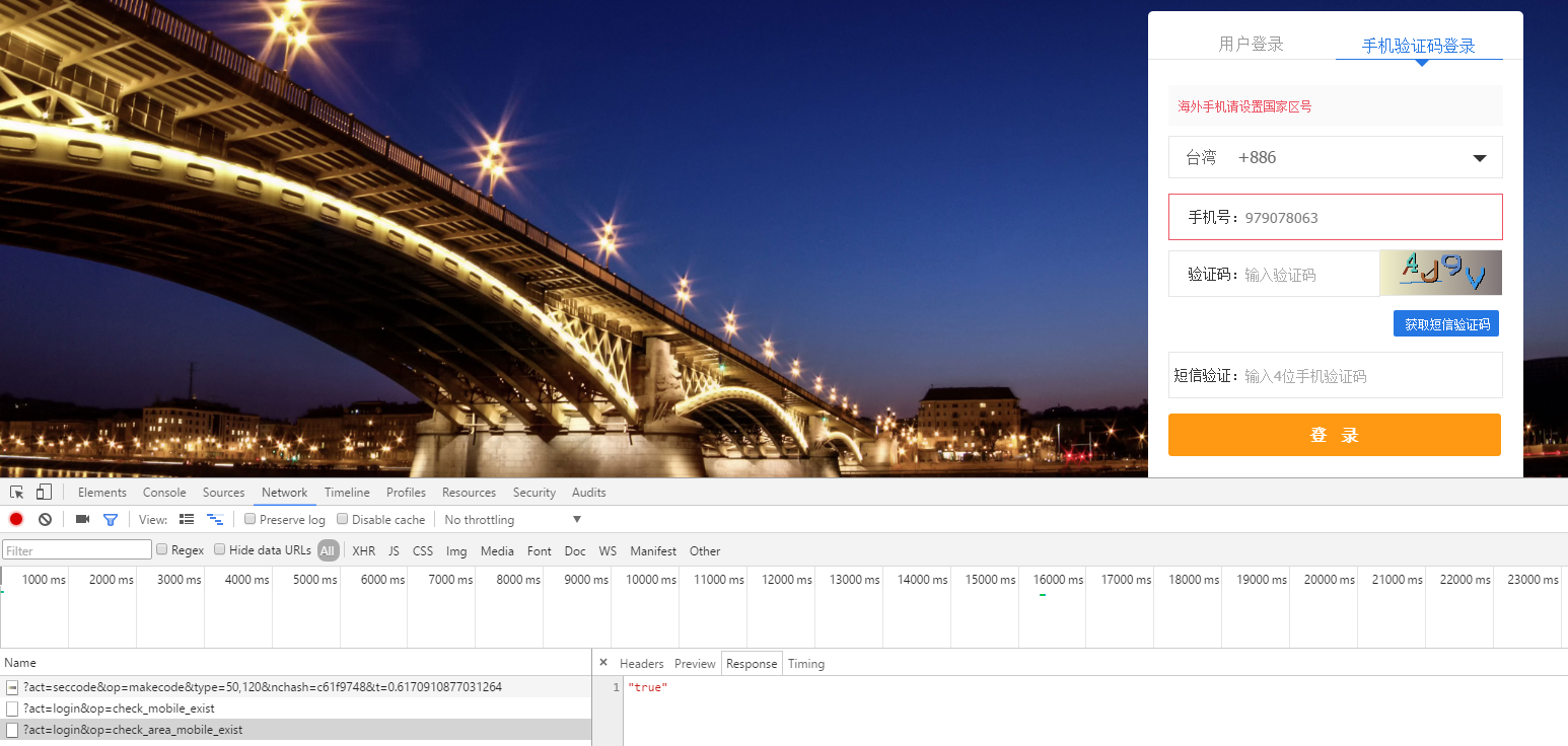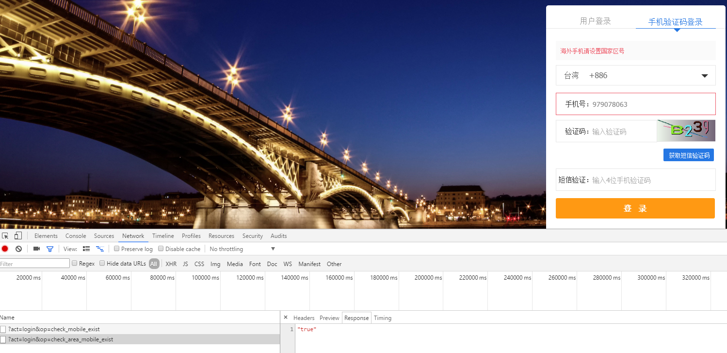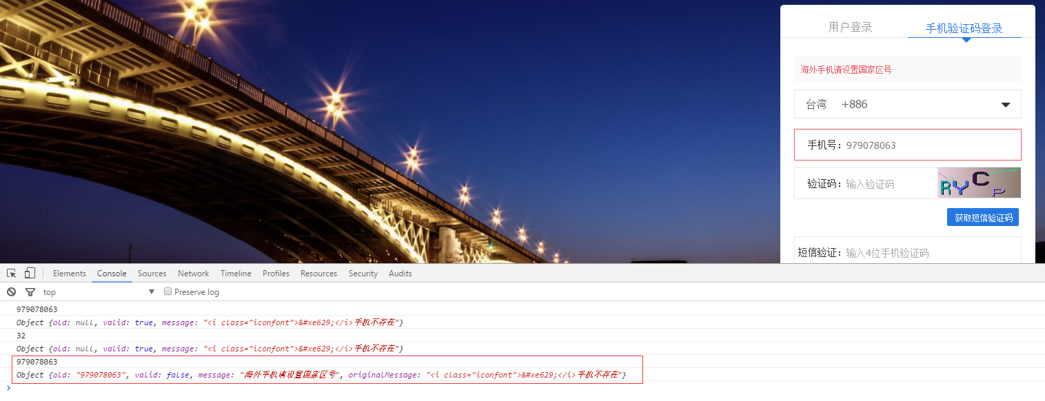 3、国家区号切换至台湾,国家区号的远程验证返回true,但是手机号码文本框仍然报错,如图3:
