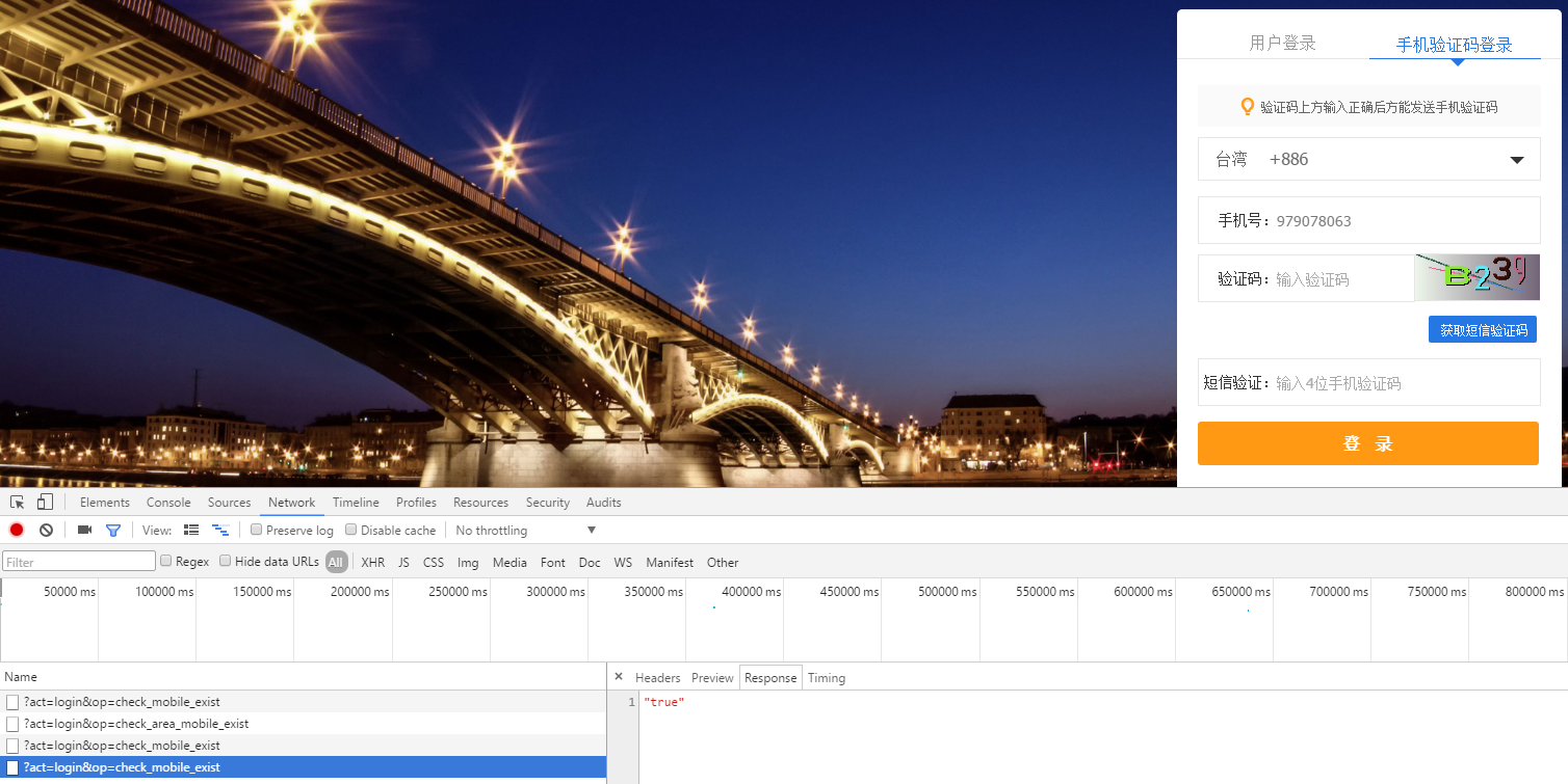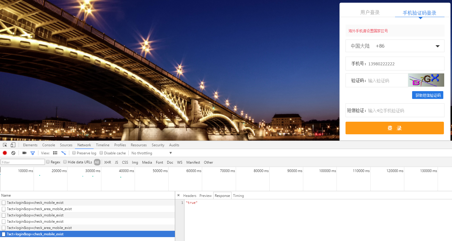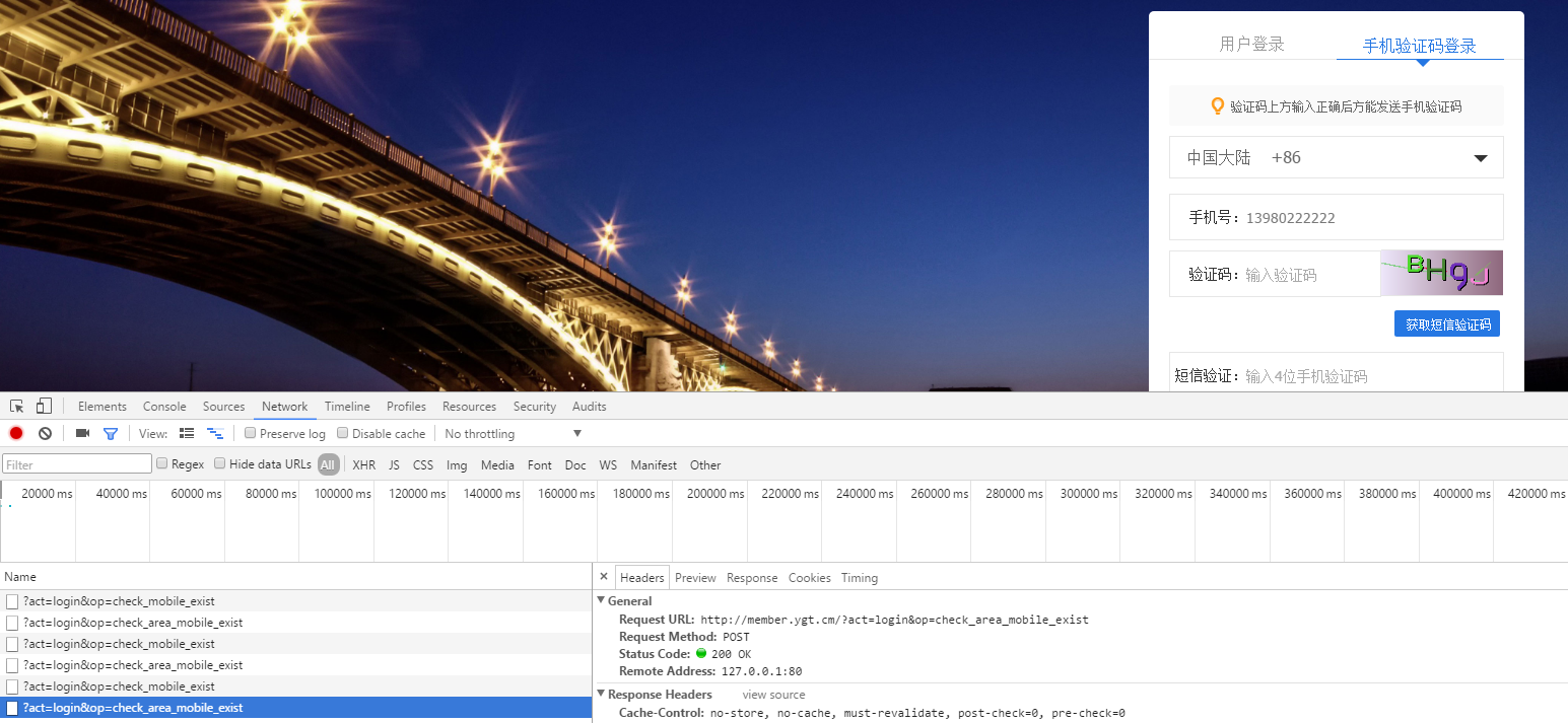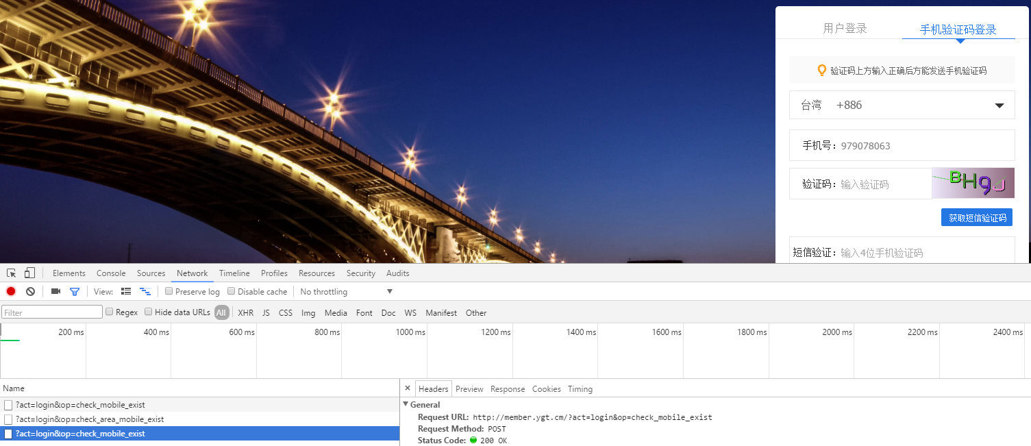 22、继续执行第2、3步,查看Network,远程验证手机号码成功执行,如图26: