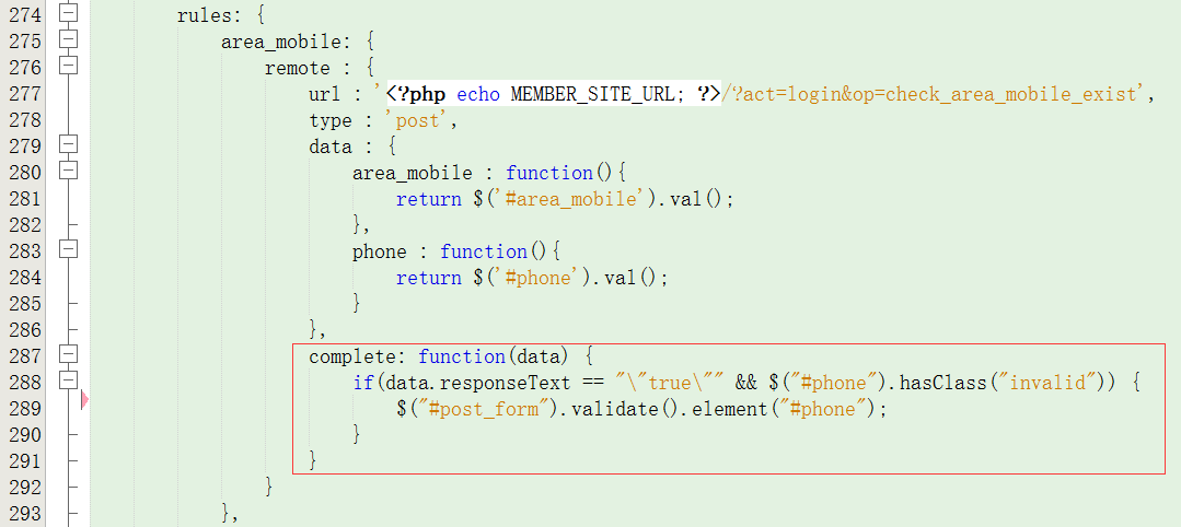 7、现在便是需要解决上述问题,需要做到国家区号与手机的同步验证,先解决如图5之前所遇见的问题,当请求完成之后调用函数,国家区号的远程验证返回true,但是手机号码文本框仍然报错,则再次远程验证一次手机号码,代码如图8: