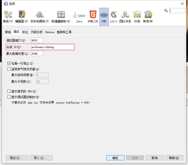 2、分析发现”PHP”选项的”Debugging”(调试)标签,Session ID(会话 ID)。调试会话的任意名称。默认情况下为 netbeans-xdebug,如图2;