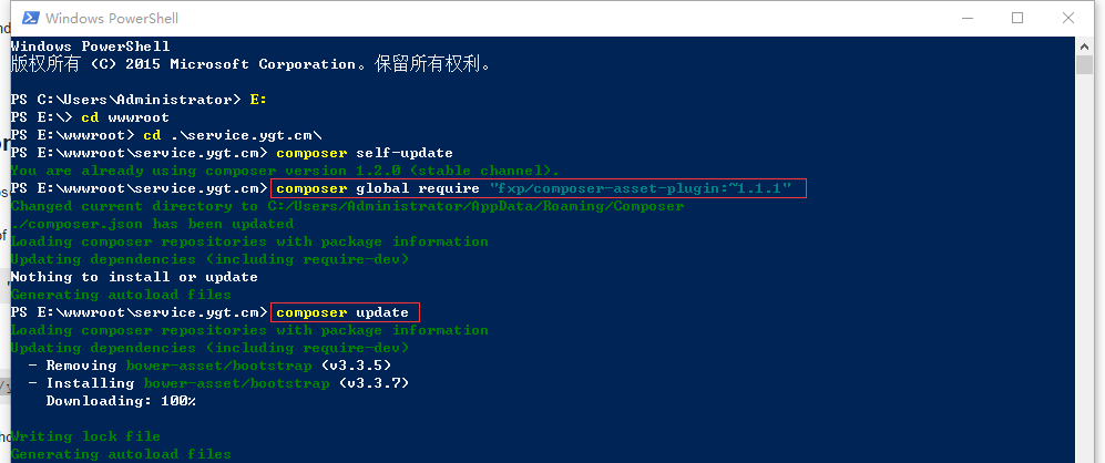 7、在Windows PowerShell中执行命令:composer update,如图6: