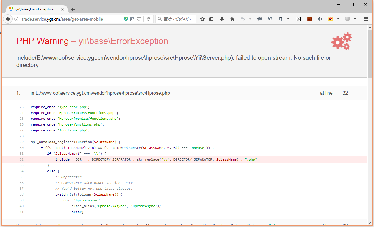 include(E:\wwwroot\service.ygt.cm\vendor\hprose\hprose\src\Hprose\Yii\Server.php): failed to open stream: No such file or directory