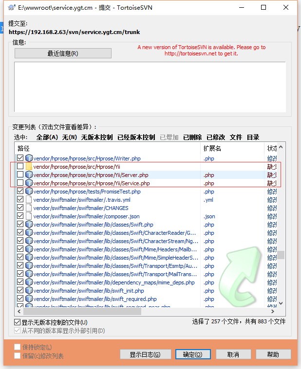 4、分析原因,发现升级之后,提交SVN时,E:\wwwroot\service.ygt.cm\vendor\hprose\hprose\src\Hprose\Yii 已经缺少了,如图3: