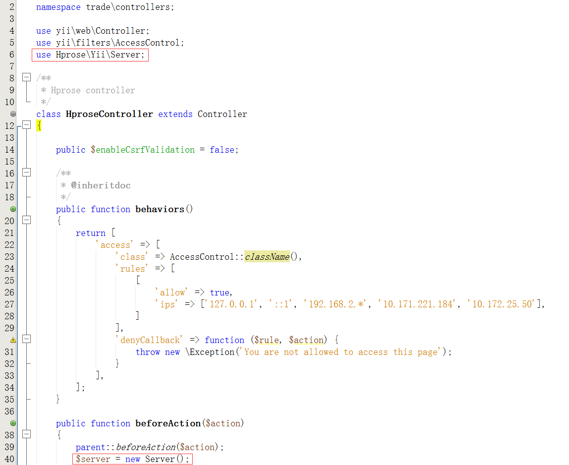 5、E:\wwwroot\service.ygt.cm\trade\controllers\HproseController.php 的源代码截图,引用的类文件已经不存在,自然报错了,如图4: