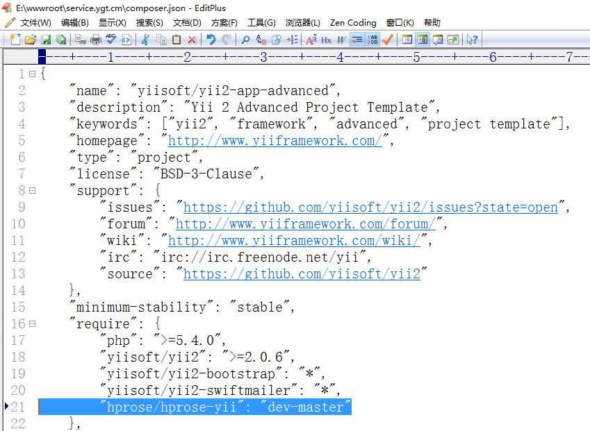 6、打开网址:https://github.com/hprose/hprose-php/wiki/%E5%AE%89%E8%A3%85 ,编辑E:\wwwroot\service.ygt.cm\composer.json,如图5: