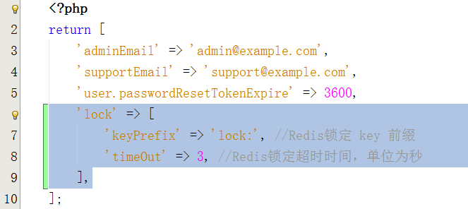 1、设置锁定的过期时间:当前的 Unix 时间戳 + Redis锁定超时时间,单位为秒(3),编辑文件:\common\config\params.php,如图1