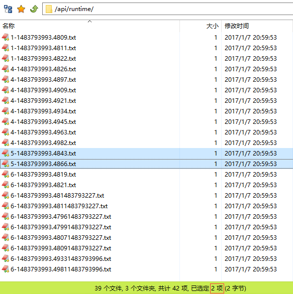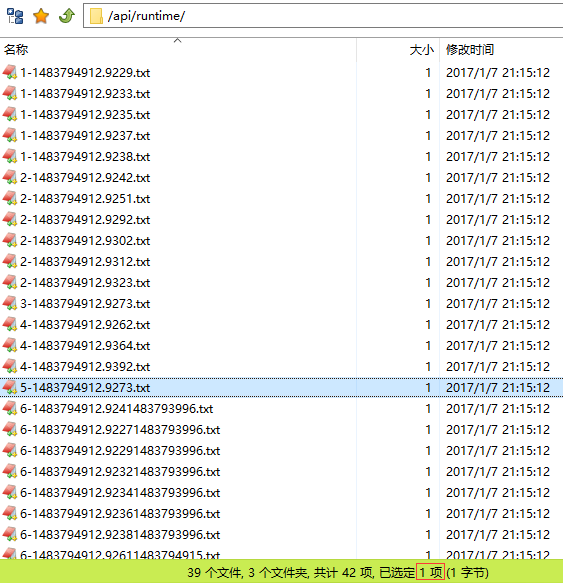 18、重复第13、14、15等3个步骤,查看\api\runtime目录下所生成的文件,以0、6开头的文件数量为10,以1开头的文件数量为7,以2开头的文件数量为6,以3开头的文件数量为1,以4开头的文件数量为3,以5开头的文件数量为1,正常,如图21