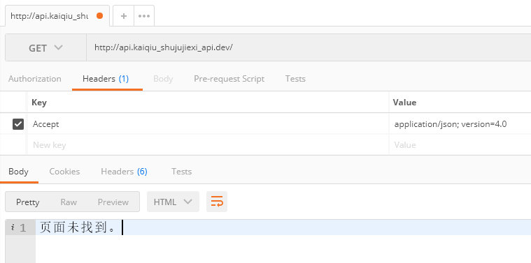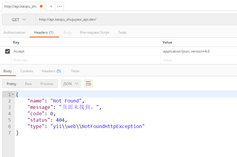 2、在 Postman 中请求:http://api.kaiqiu_shujujiexi_api.dev/ ,响应404,如图2
