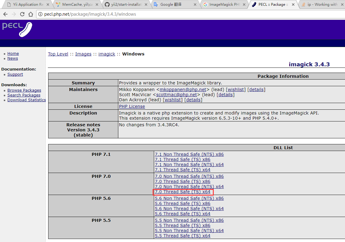 1、打开:http://pecl.php.net/package/imagick/3.4.3/windows ,下载:7.0 Thread Safe (TS) x64,如图1