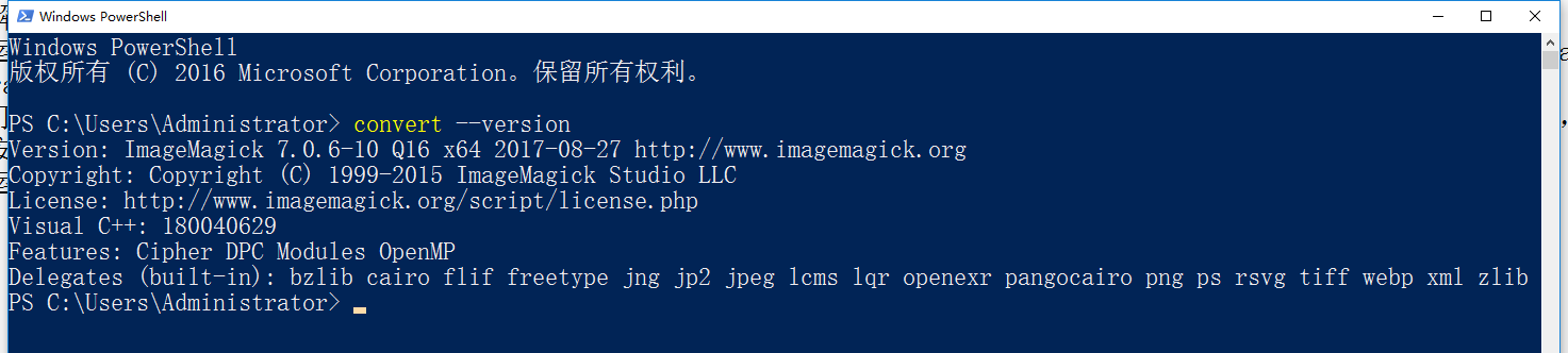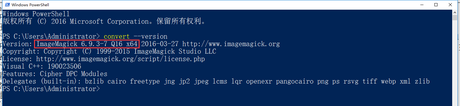15、运行:convert –version,正常,版本更新为:ImageMagick 6.9.3-7 Q16 x64,如图15