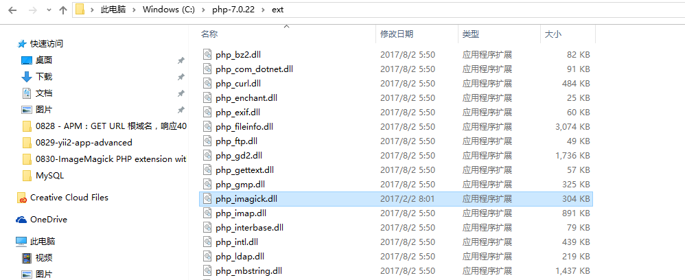 2、解压缩后,复制 php_imagick.dll 至 C:\php-7.0.22\ext,如图2