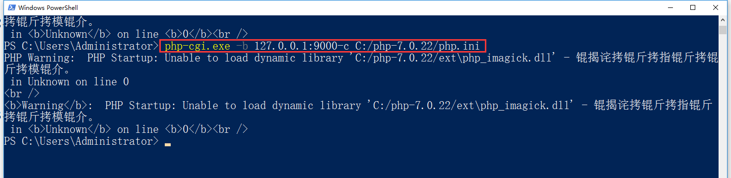 3、运行:php-cgi.exe -b 127.0.0.1:9000-c C:/php-7.0.22/php.ini,报错:PHP Warning: PHP Startup: Unable to load dynamic library ‘C:/php-7.0.22/ext\php_imagick.dll’,如图3