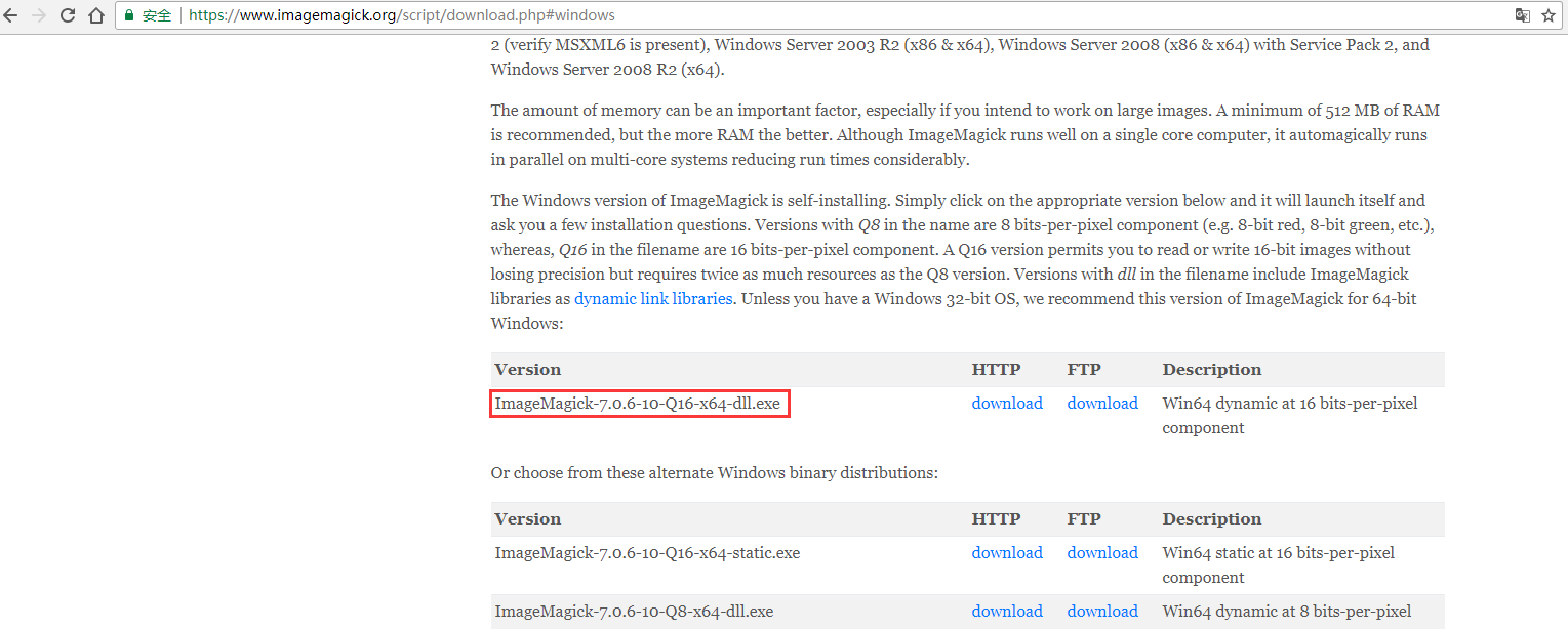 4、打开:https://www.imagemagick.org/script/download.php#windows ,下载:ImageMagick-7.0.6-10-Q16-x64-dll.exe,如图4